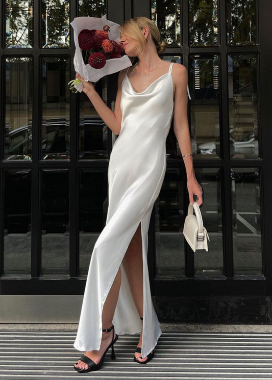 - Détails soignés : Les fines bretelles et le tissu plissé ajoutent une texture raffinée et un effet visuel captivant, créant un look à la fois minimaliste et sophistiqué.